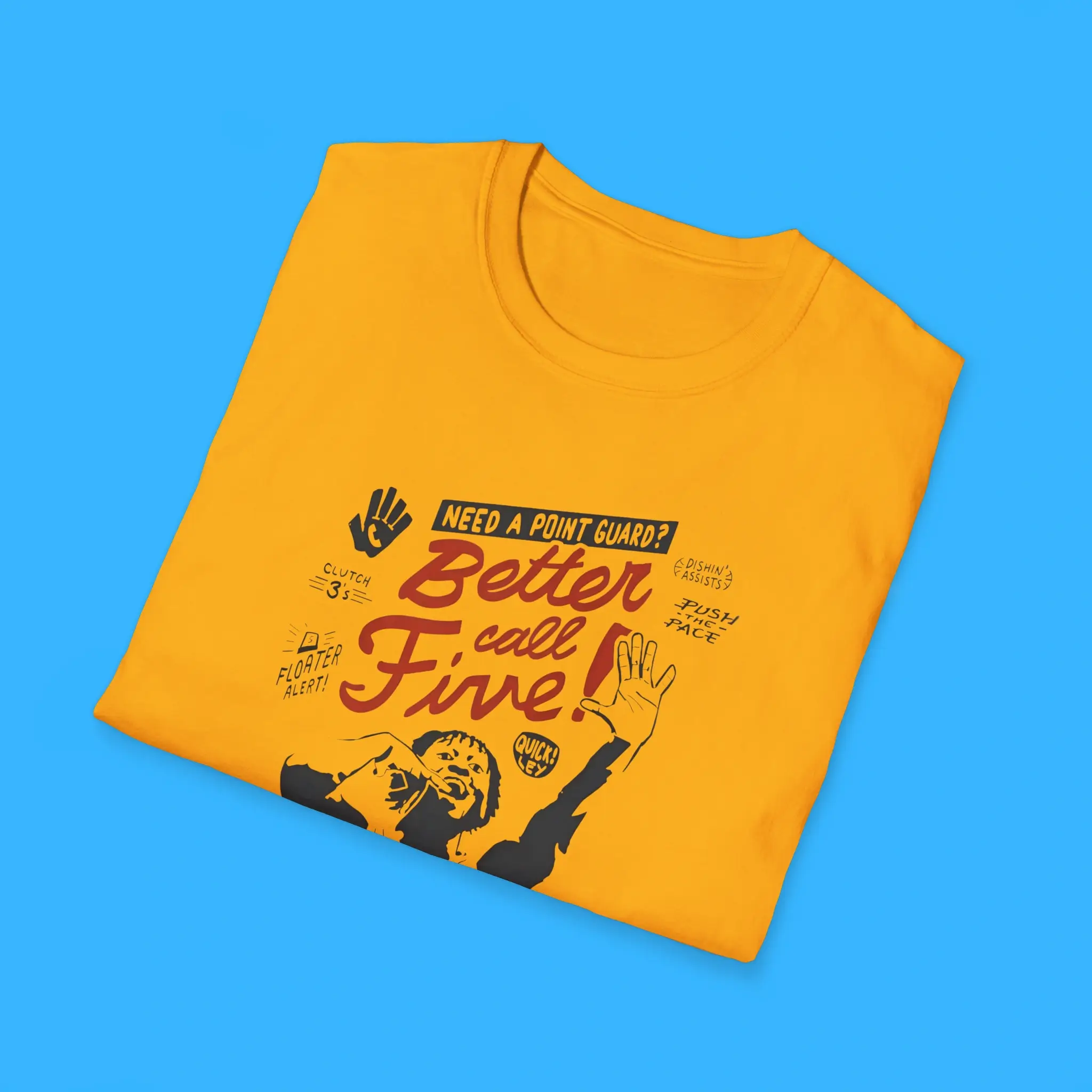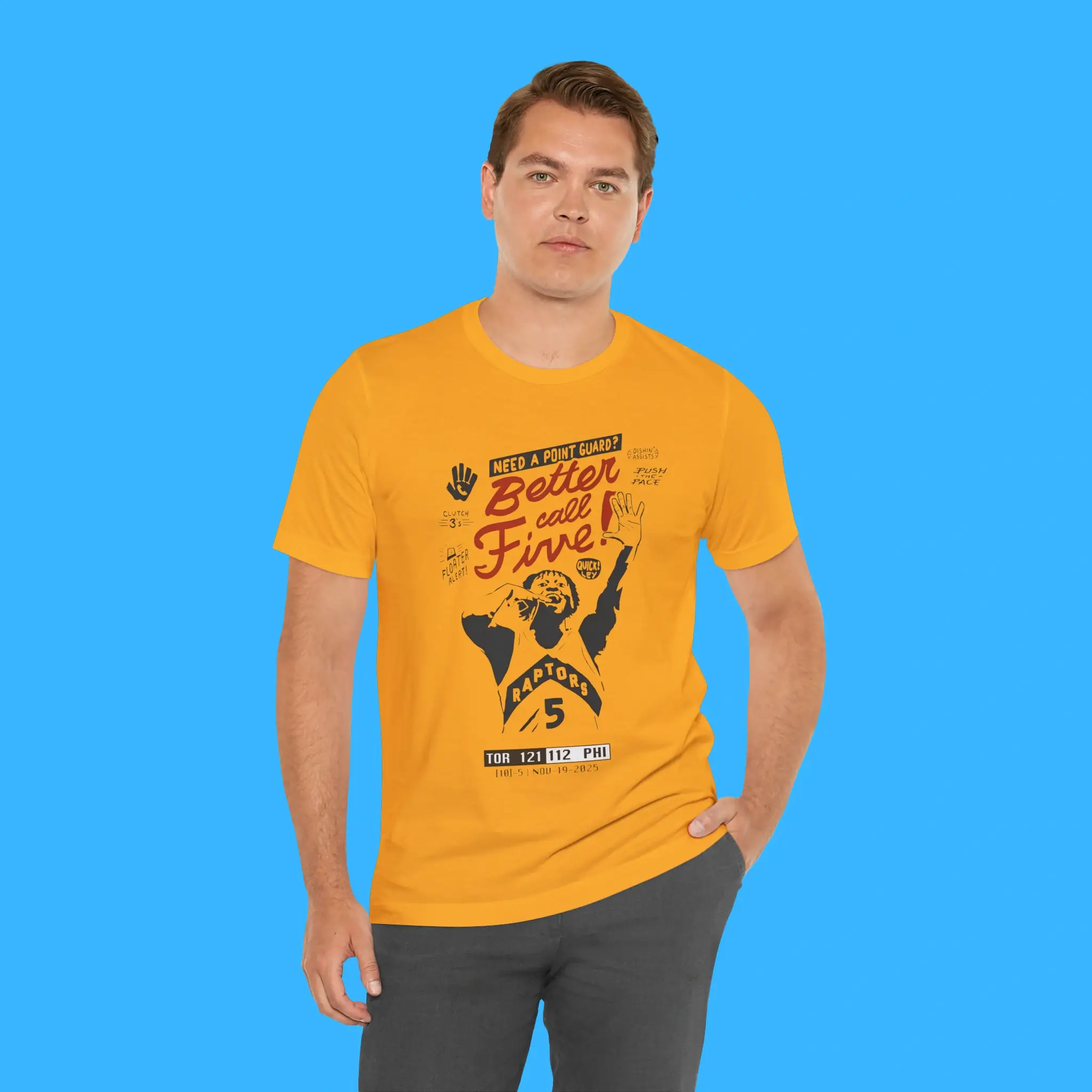 The design features a fun “Better Call Five” concept inspired by Quickley’s jersey number. It stands out from standard team gear. In addition, the graphic has a clean layout that looks great on many shirt colors. You can wear it to games, viewing parties, or casual outings. The versatile design allows you to pair it easily with jeans, shorts, or athletic outfits.