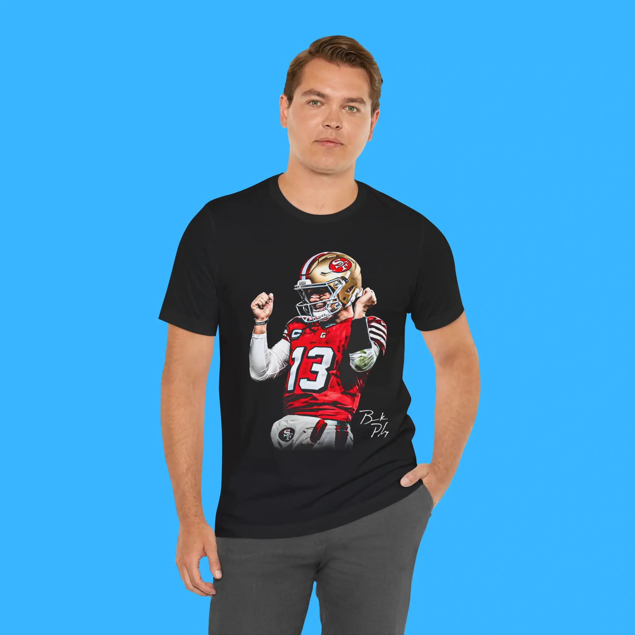 Crafted from high-quality cotton and polyester, this Brock Purdy T-shirt is soft, breathable, and durable. It ensures comfort whether you’re watching the game at home, cheering in the stadium, or enjoying casual everyday wear. The shirt comes in multiple sizes and colors, making it easy to find your perfect fit.