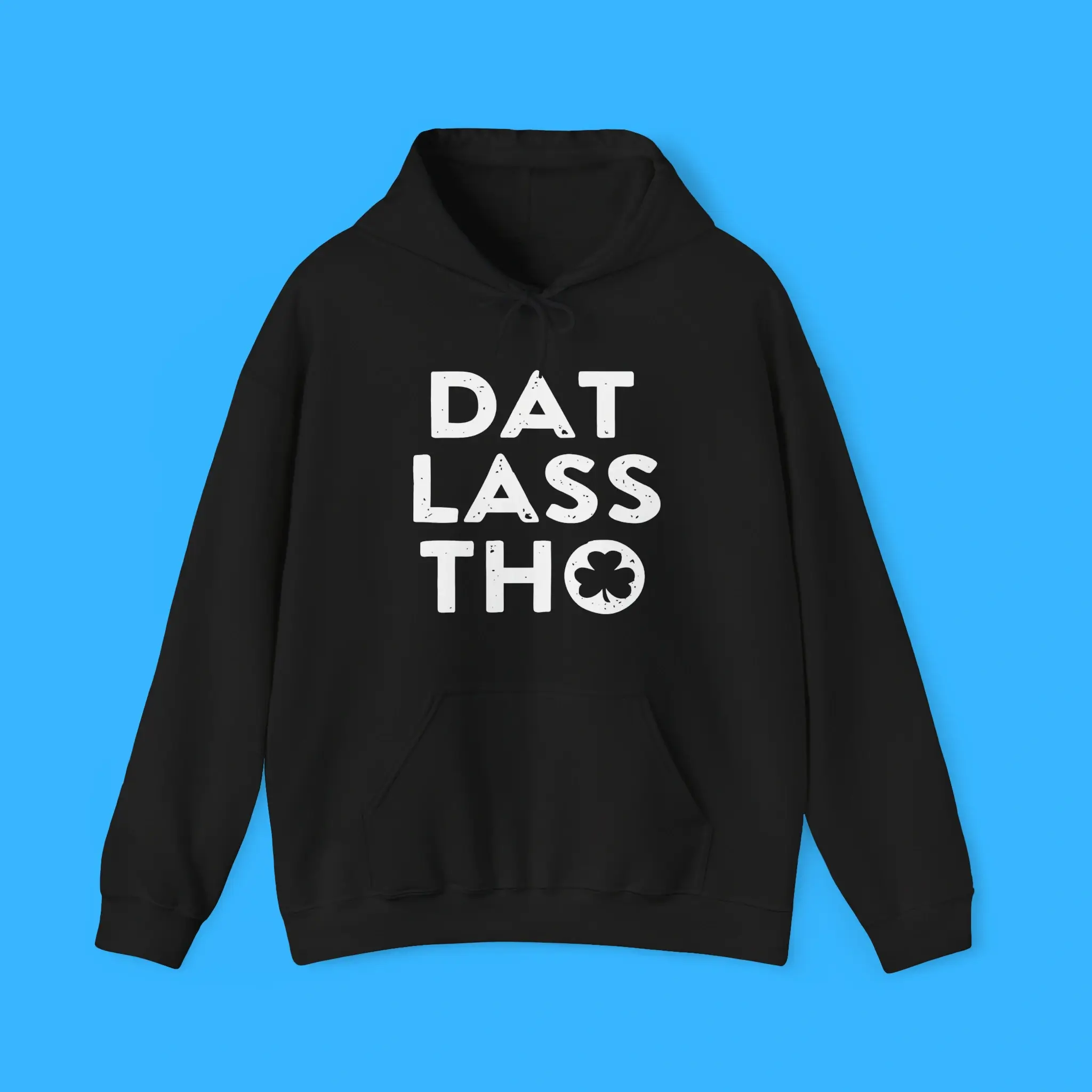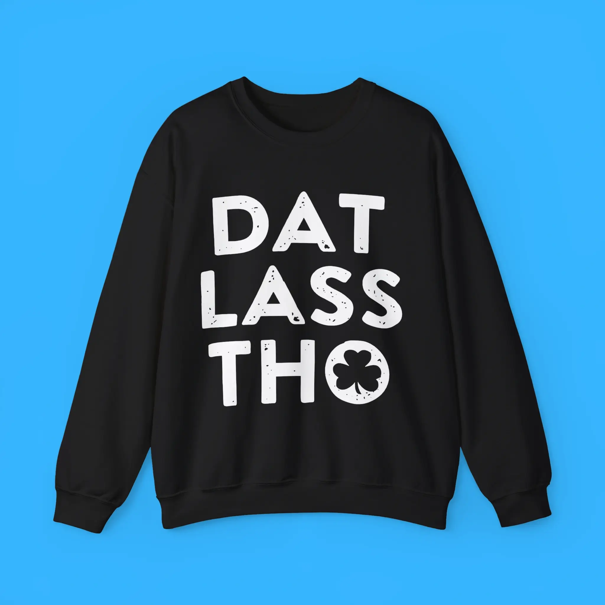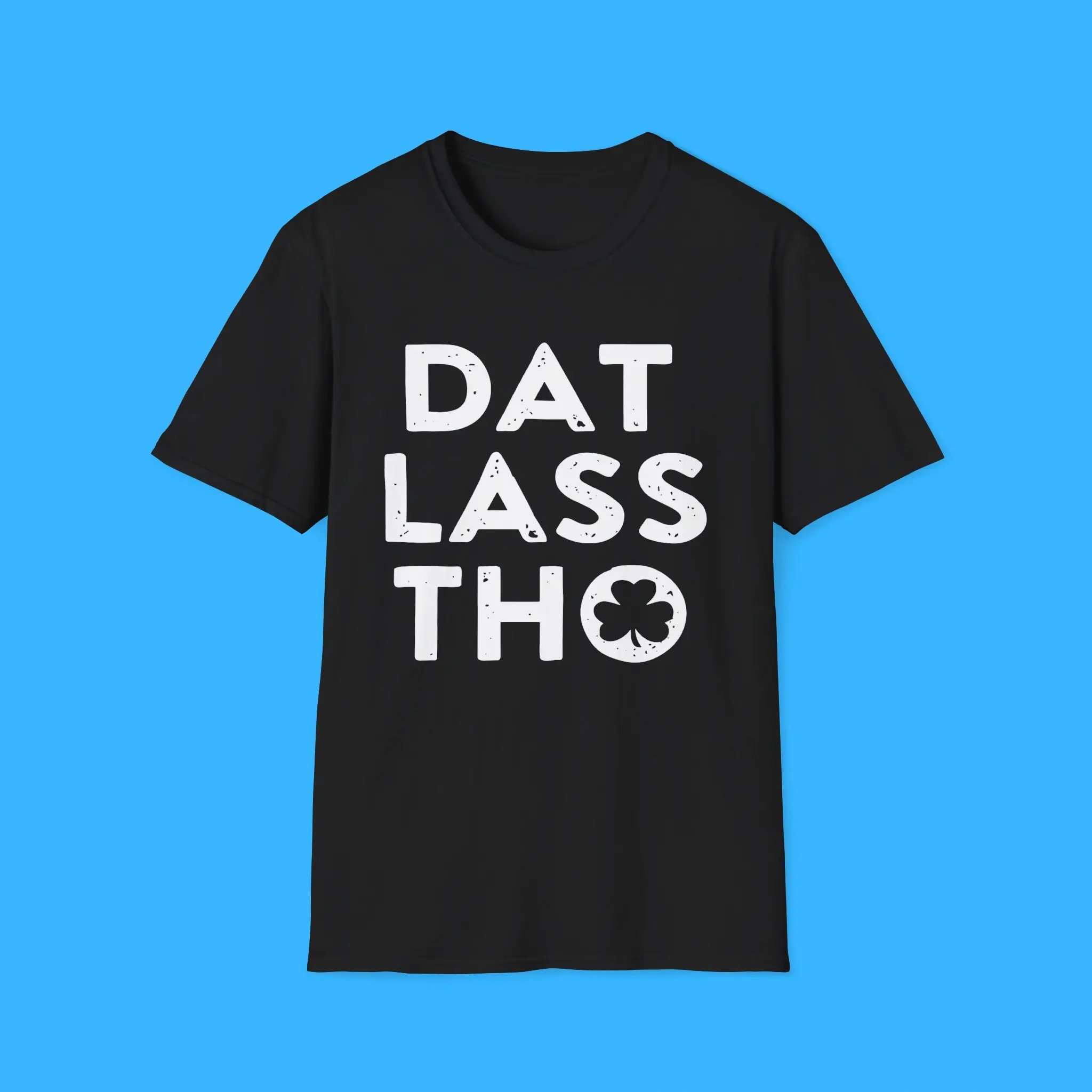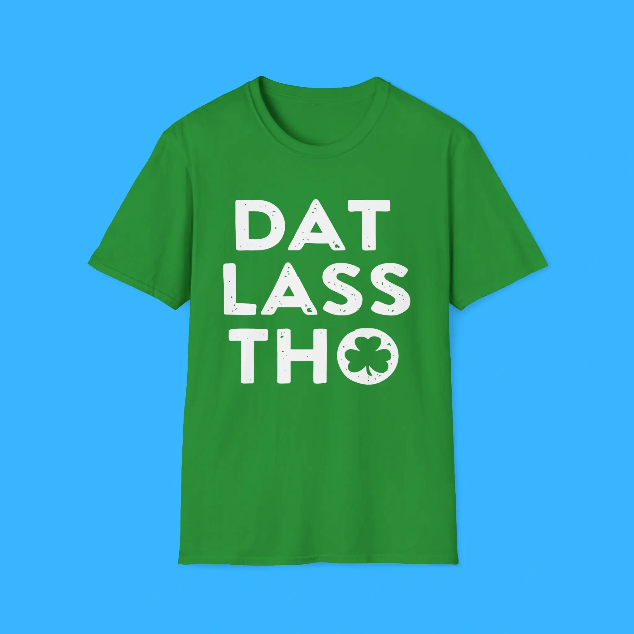 First, the design grabs attention with the bold “DAT LASS THO” phrase and a classic shamrock graphic. Together, they create a playful look that captures the spirit of Irish humor. Because of this, the shirt quickly becomes a conversation starter at parties and gatherings.