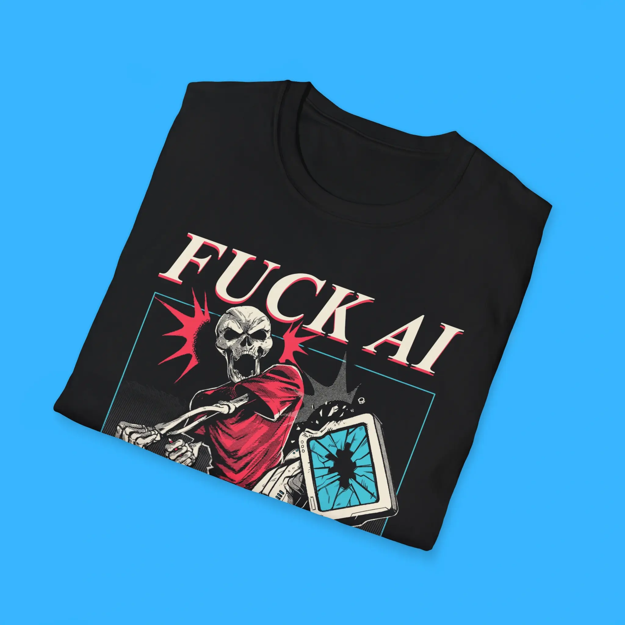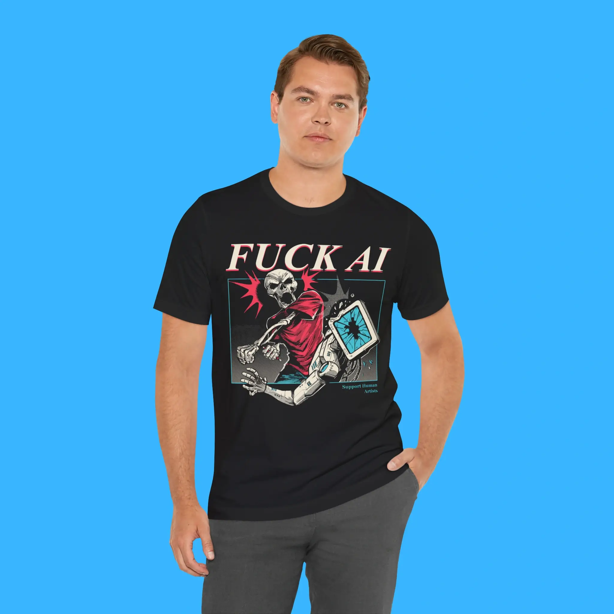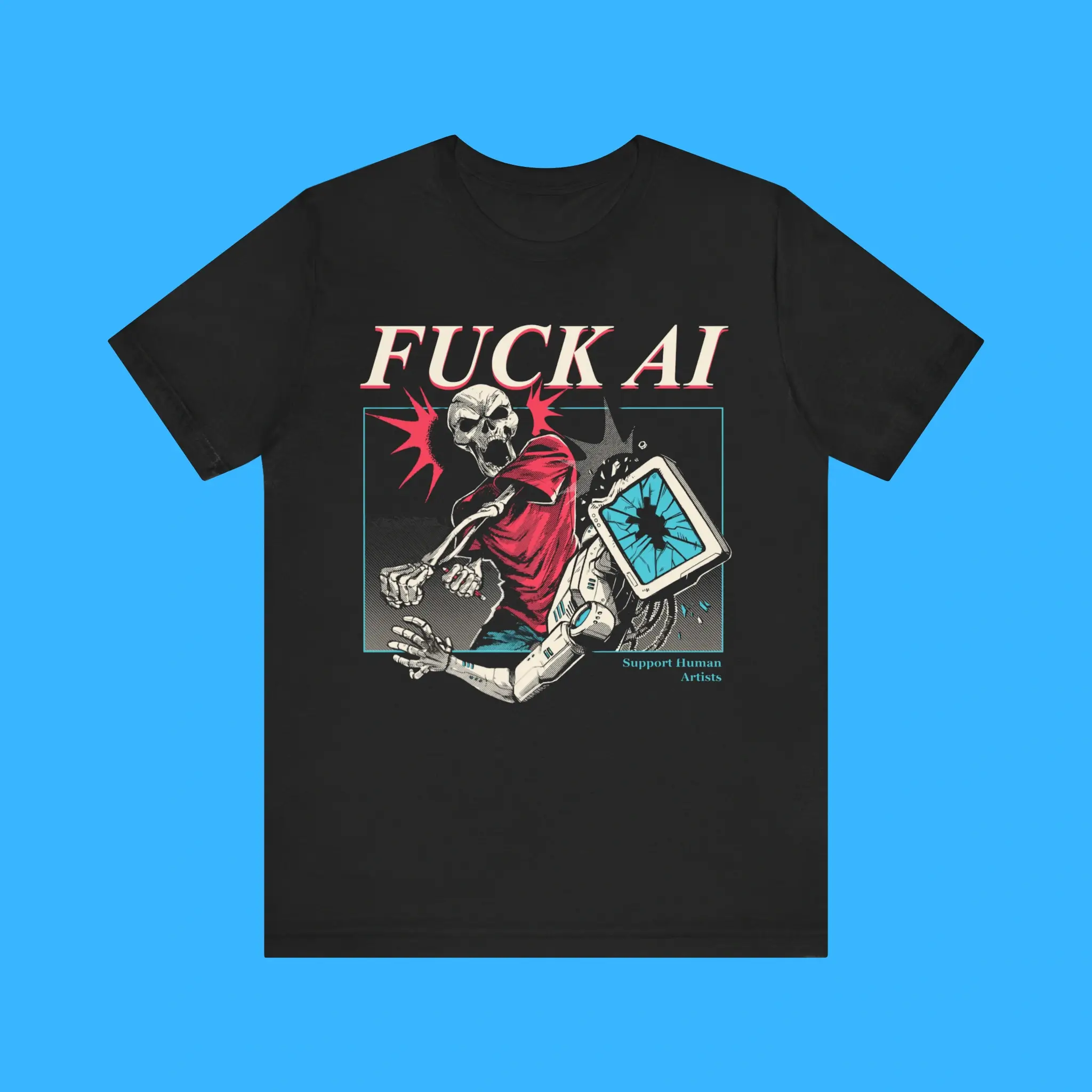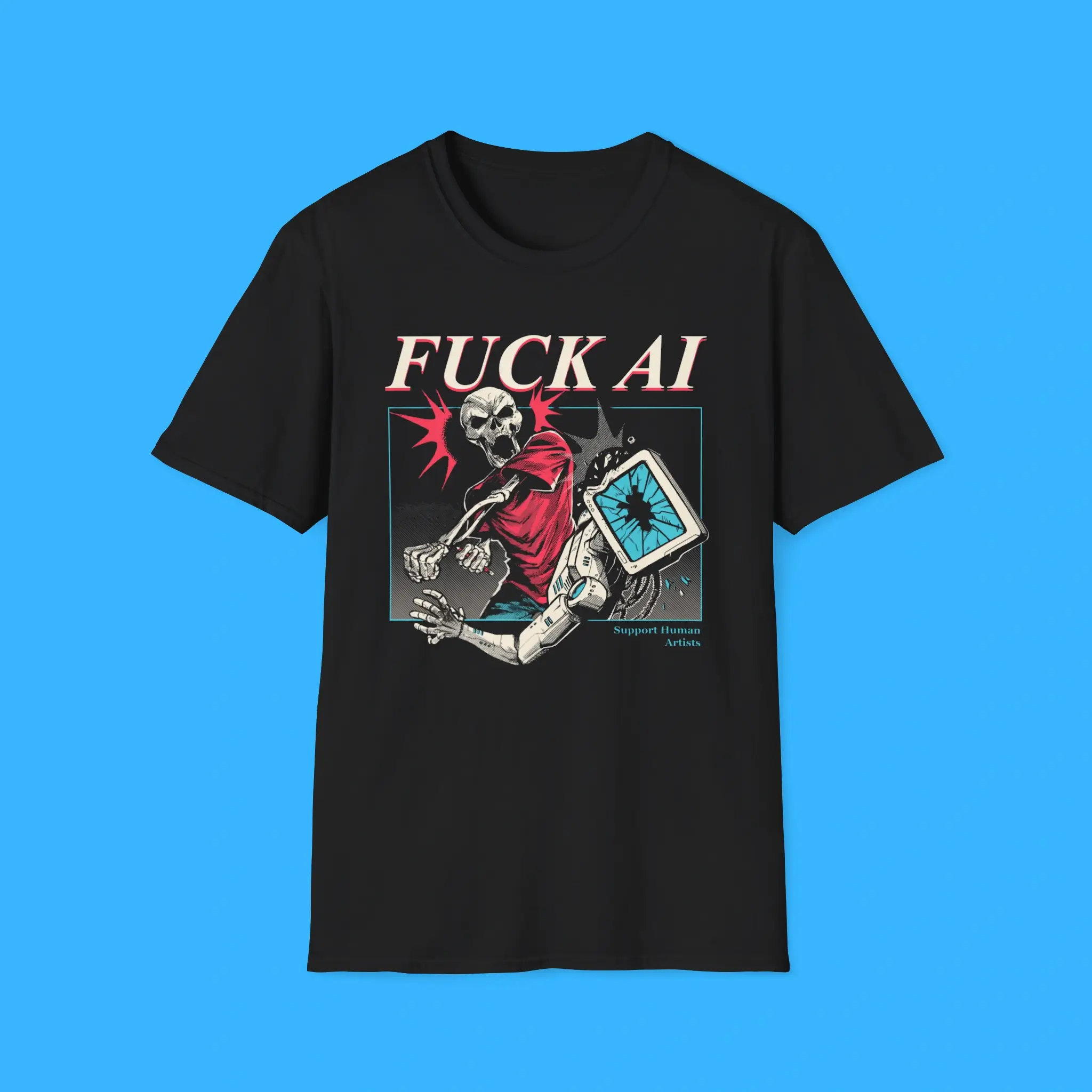 Stand up for real talent. Support creativity made by humans, not machines. Order your FUCK AI SUPPORT HUMAN ARTISTS Tee today and wear your values with pride.
