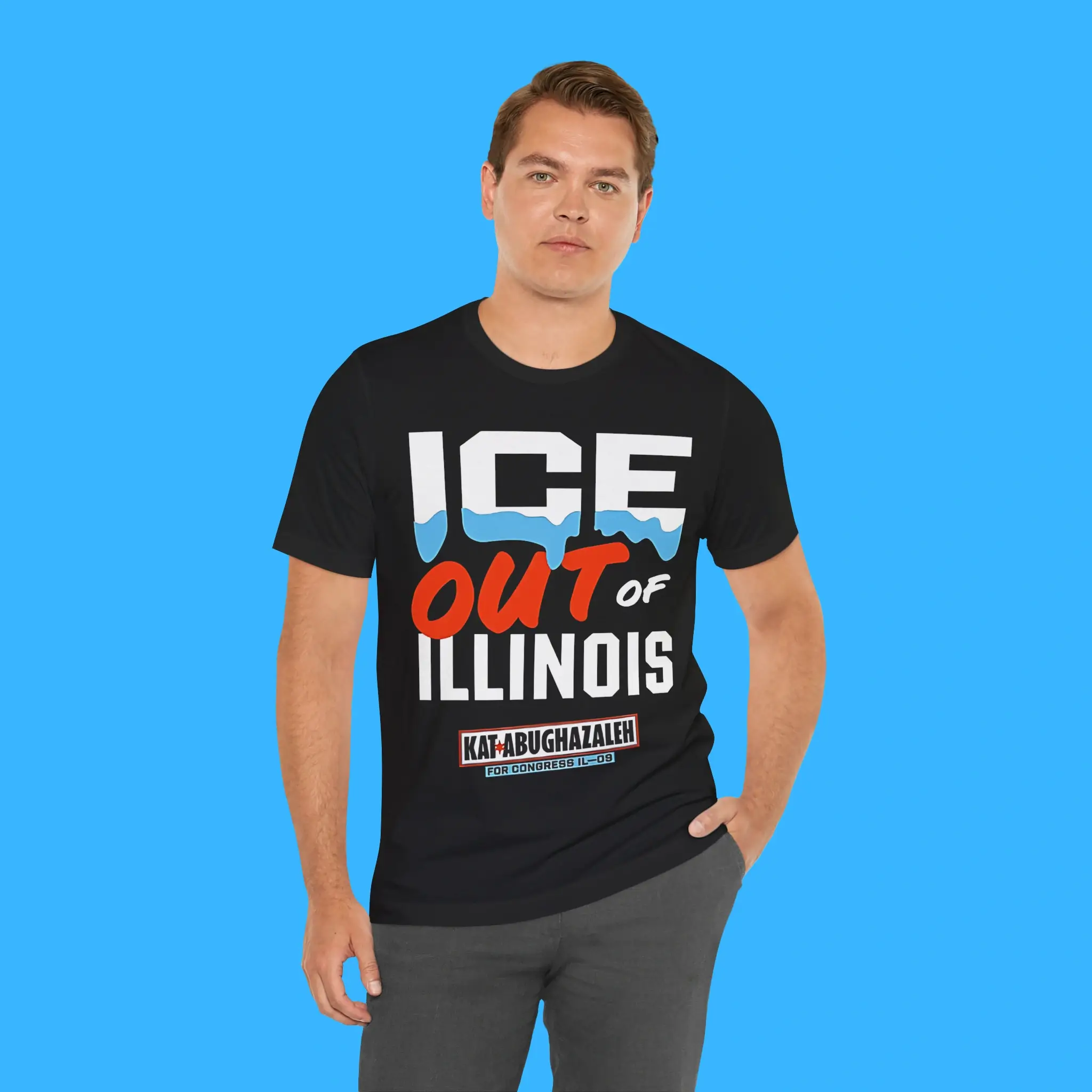 The Ice Out Of Illinois Kat Abughazaleh For Congress IL-09 Tee is designed for comfort and impact. Made from soft cotton and durable polyester, it is lightweight, breathable, and long-lasting. You can wear it all day, whether you are canvassing, attending events, or relaxing with friends.