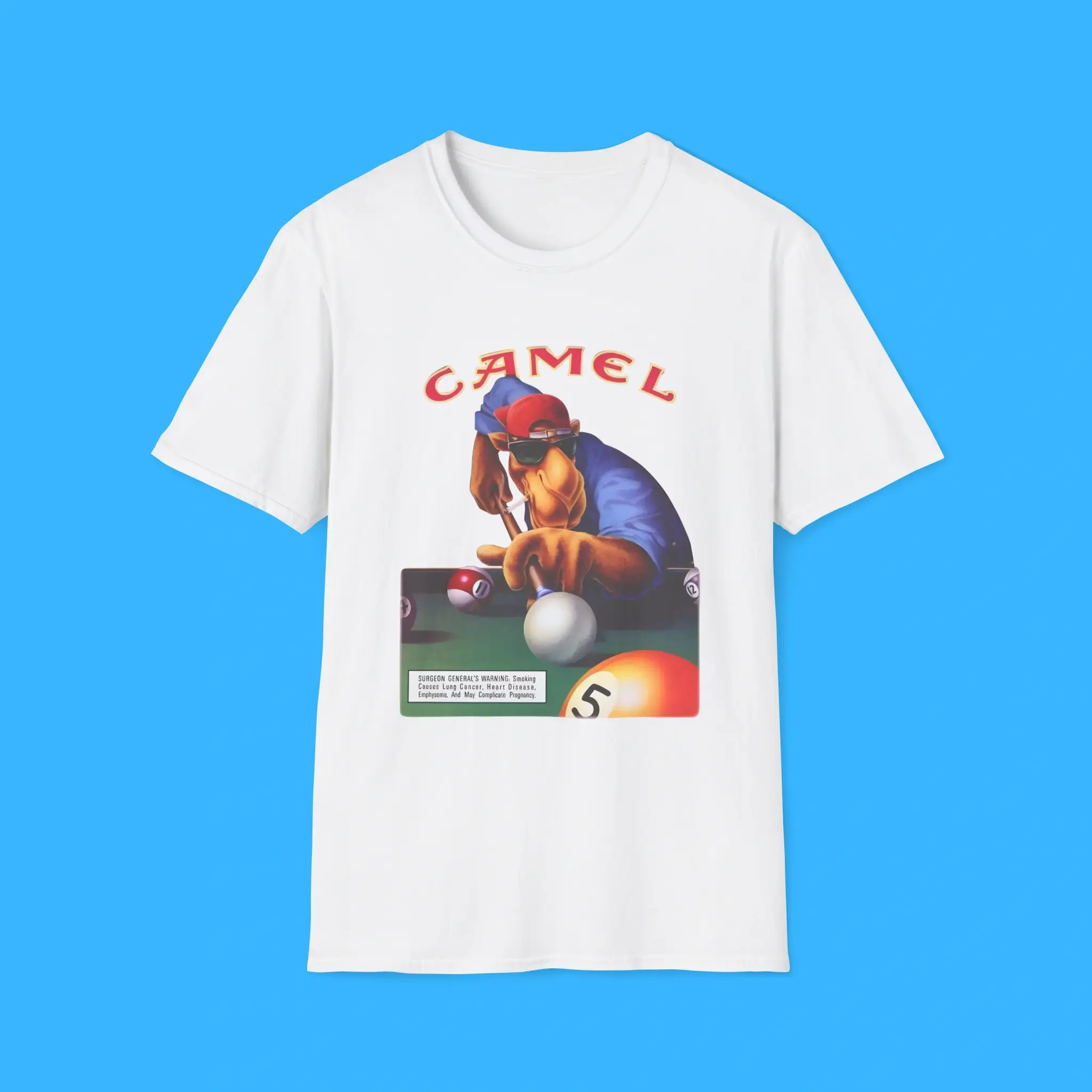 Celebrate retro style with the Joe Camel 75th Birthday Shirt inspired by the iconic 1988 design. This vintage graphic tee showcases the bold “CAMEL” logo along with the historic Surgeon General’s Warning print. As a result, it captures the unmistakable look of late-80s advertising culture.