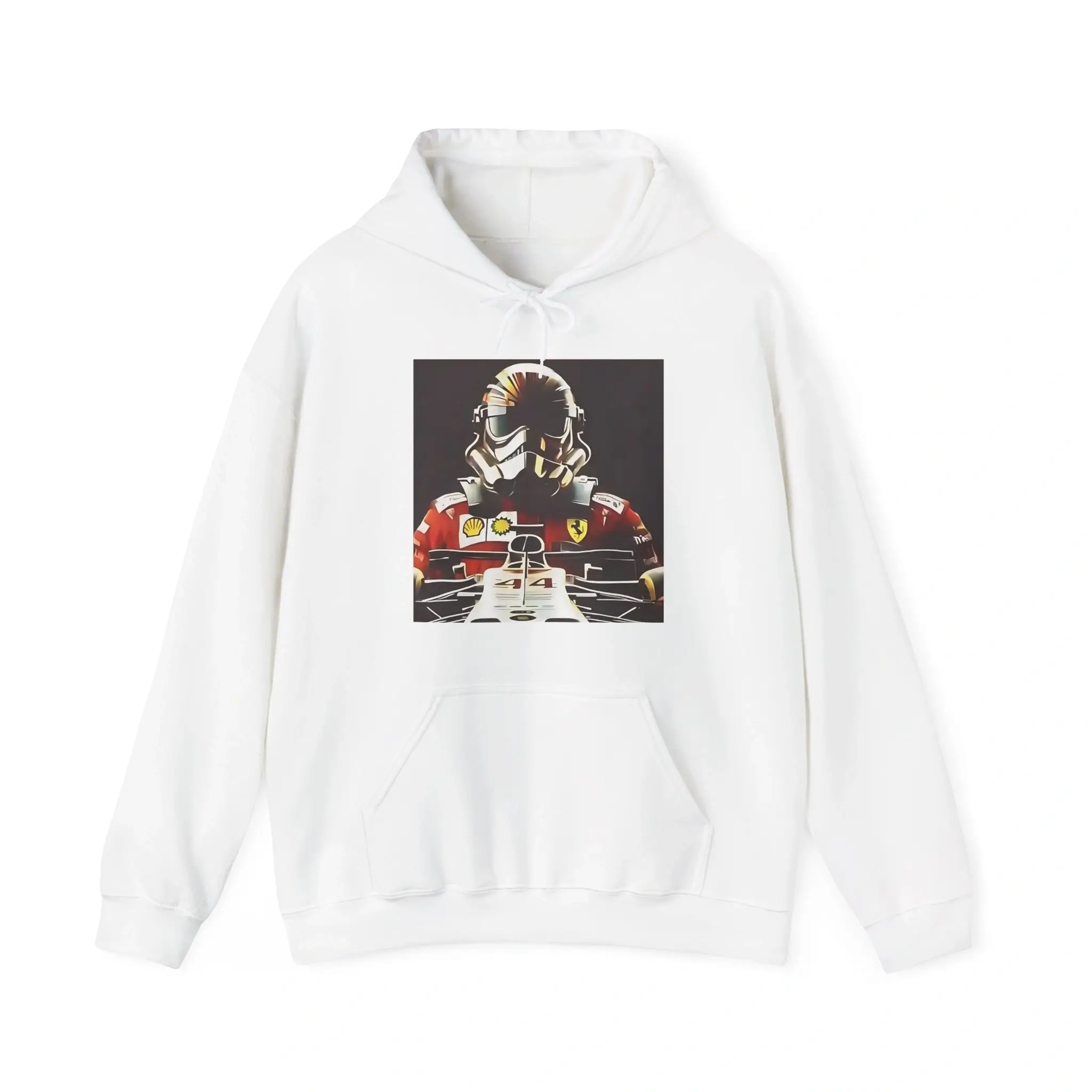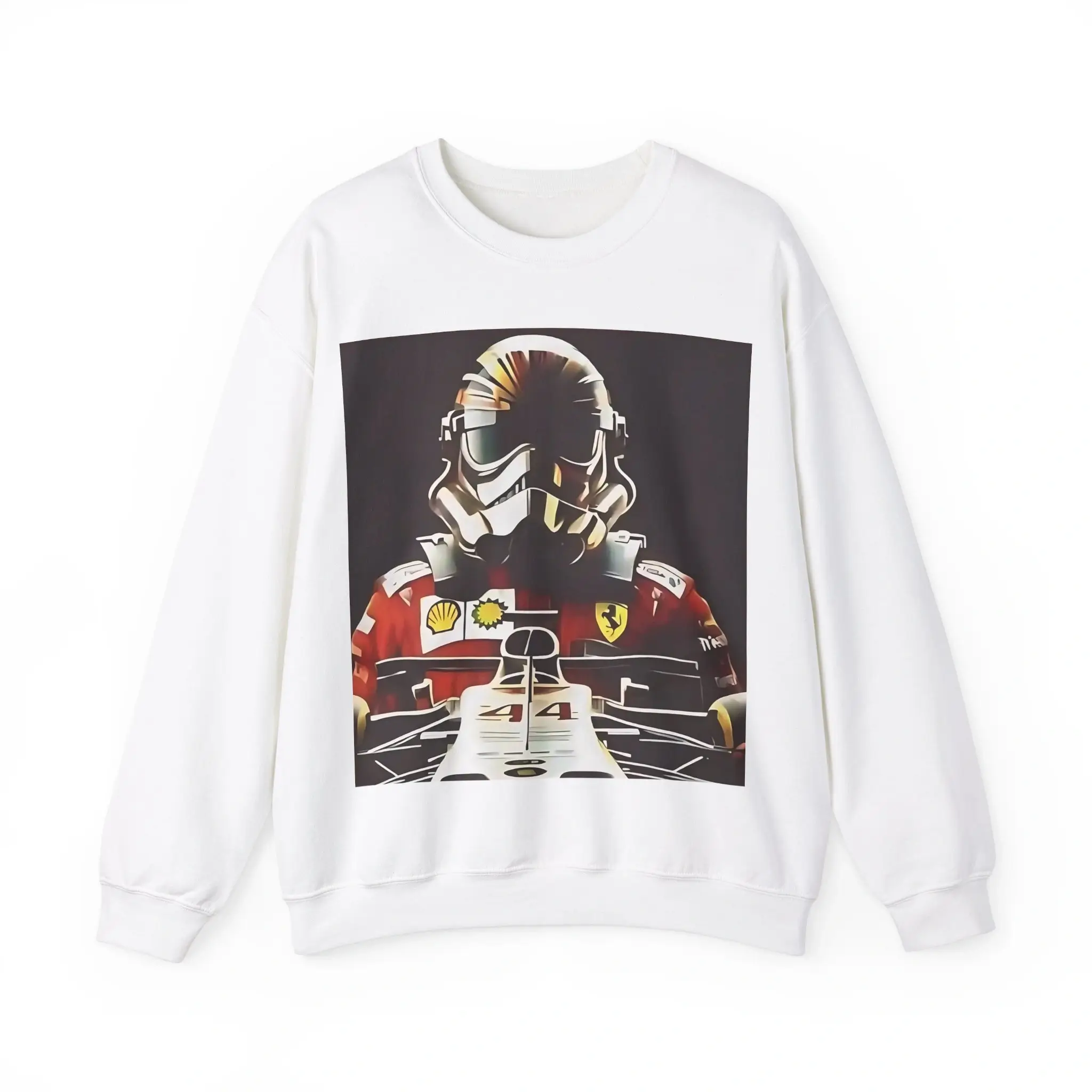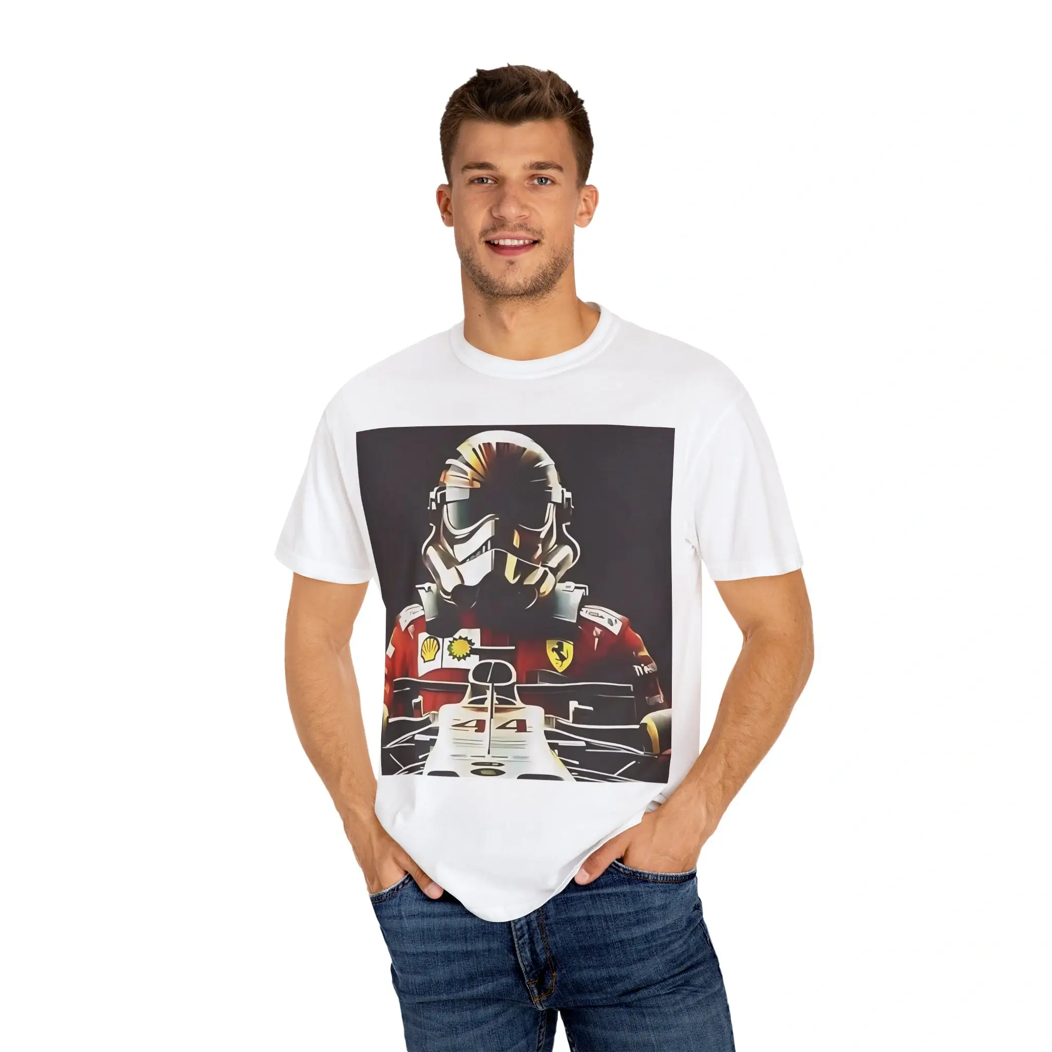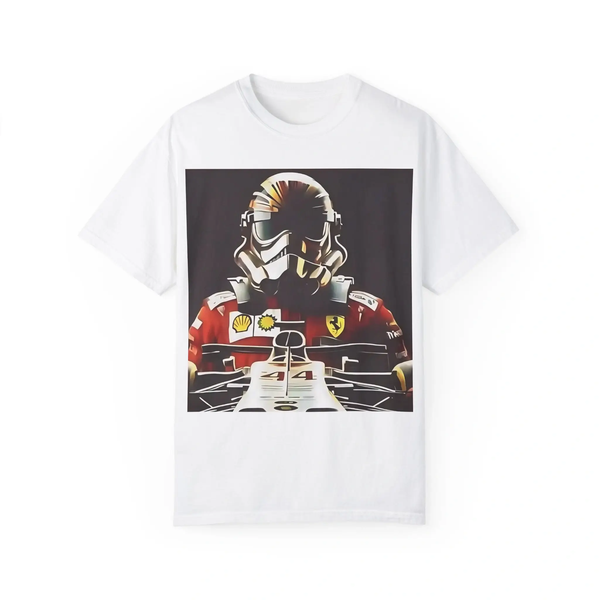 • Keywords: Formula 1 merchandise, Lewis Hamilton shirt, Ferrari-inspired clothing, Star Wars crossover tee, Stormtrooper design, F1 gift ideas.