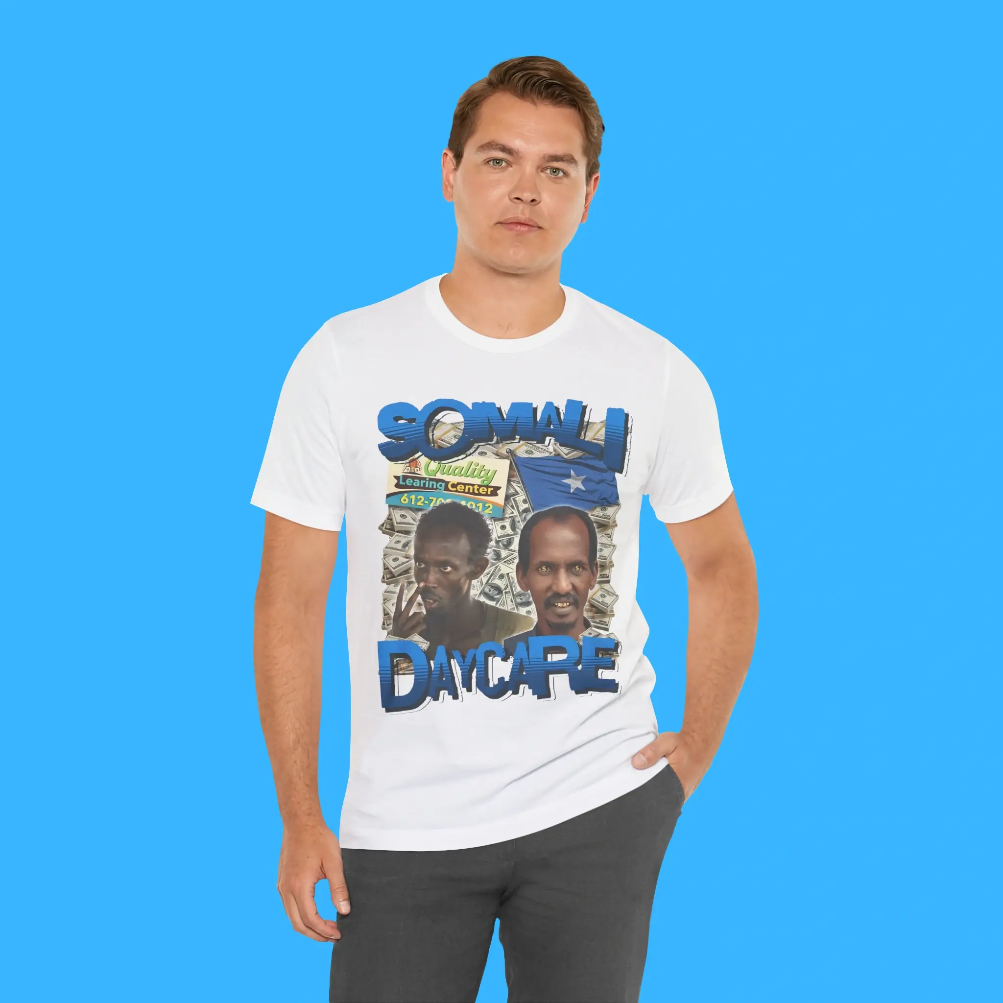 The Somali Daycare Shirt – Quality Learning Center 1-800-Fraud Tee is a bold and humorous graphic t-shirt designed for fans of satire, culture, and modern streetwear. This shirt delivers a clever parody concept that instantly grabs attention. It blends meme-style humor with a clean, readable design that works for everyday wear. If you enjoy funny graphic tees and cultural statement shirts, this design is made for you.