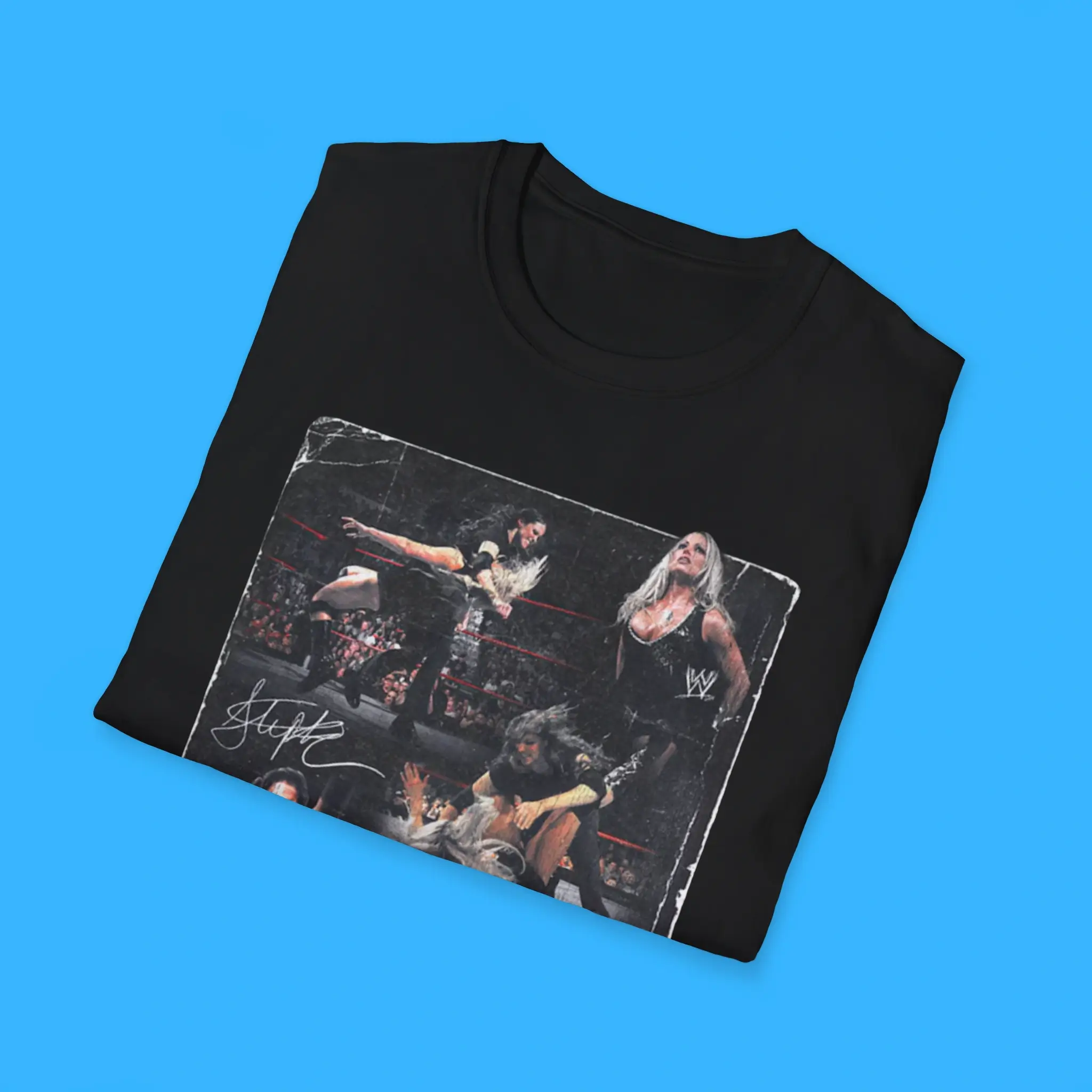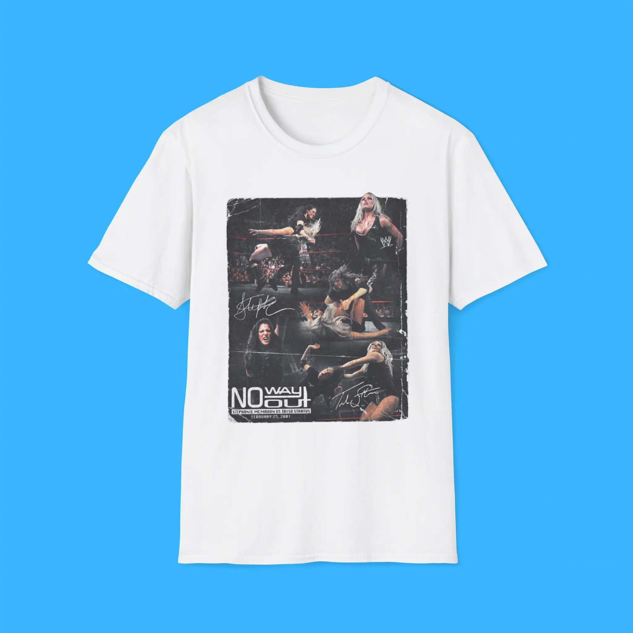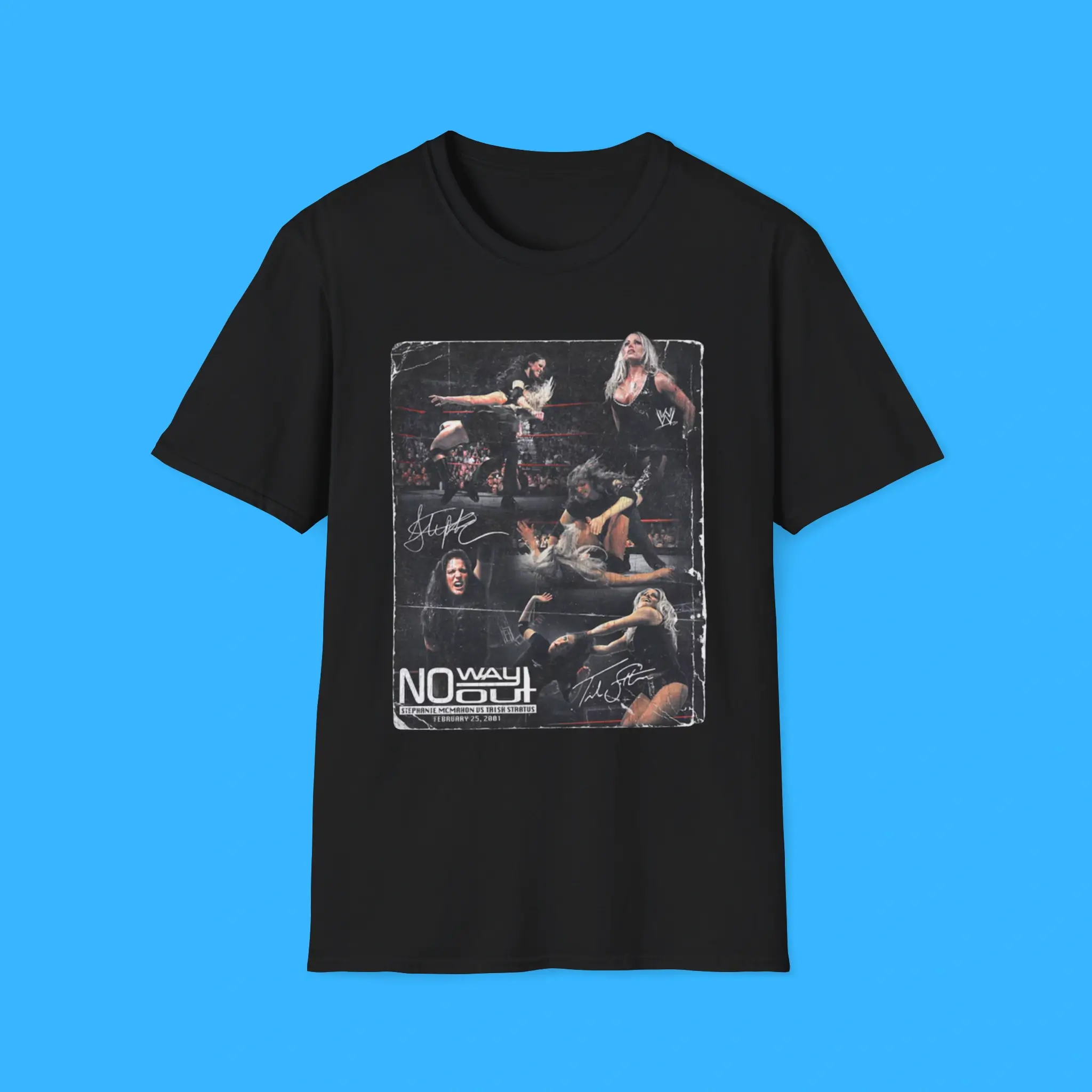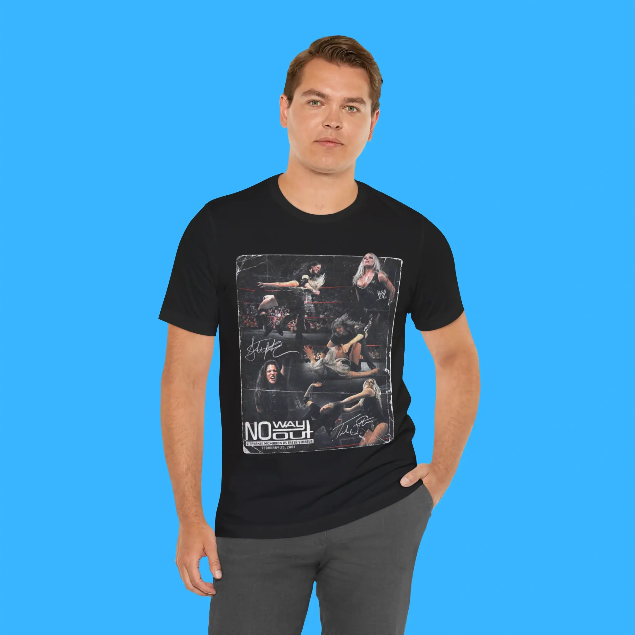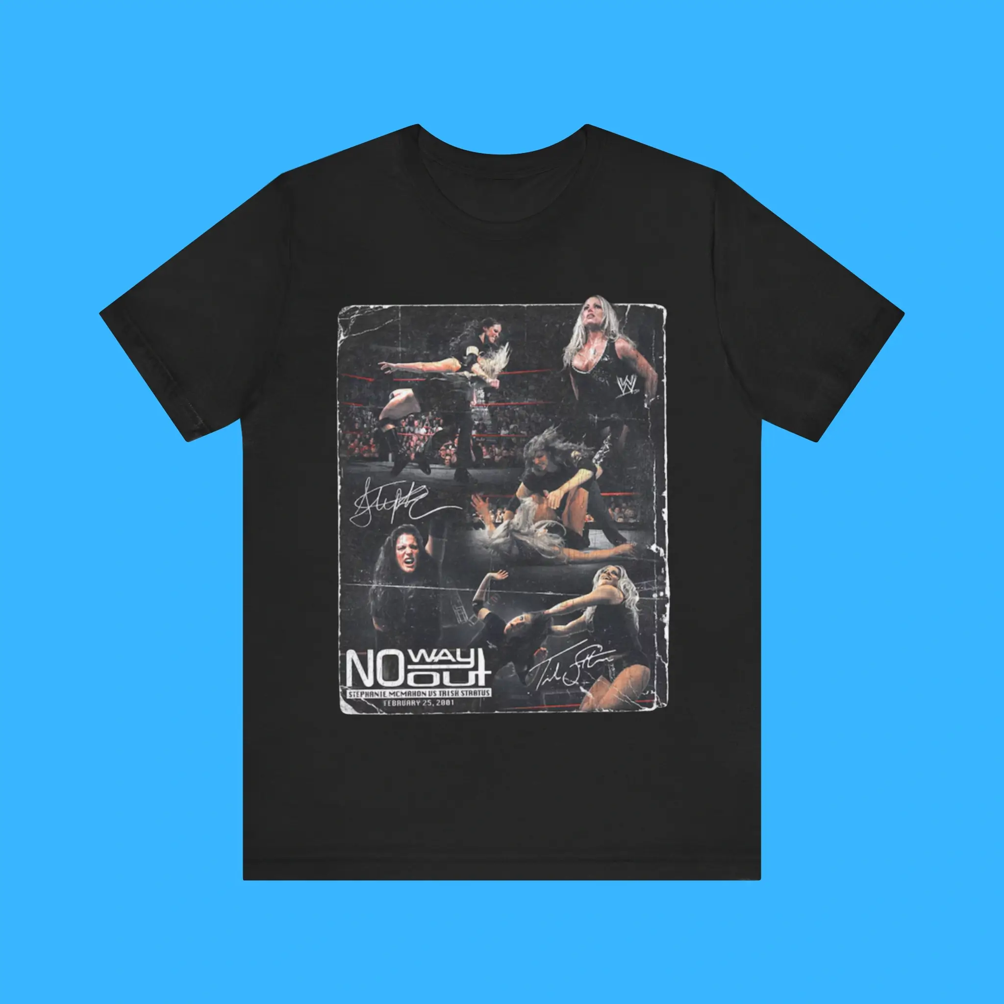 Additionally, the Stephanie McMahon vs Trish Stratus No Way Out Tee is made from premium cotton and polyester. It feels soft, breathable, and durable. Because of this, it is comfortable for everyday wear. You can wear it to wrestling events, fan conventions, or casual outings. It also pairs easily with jeans, hoodies, or jackets.