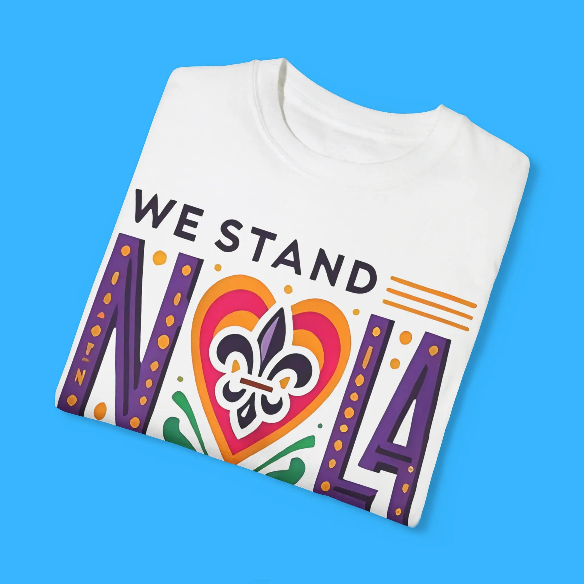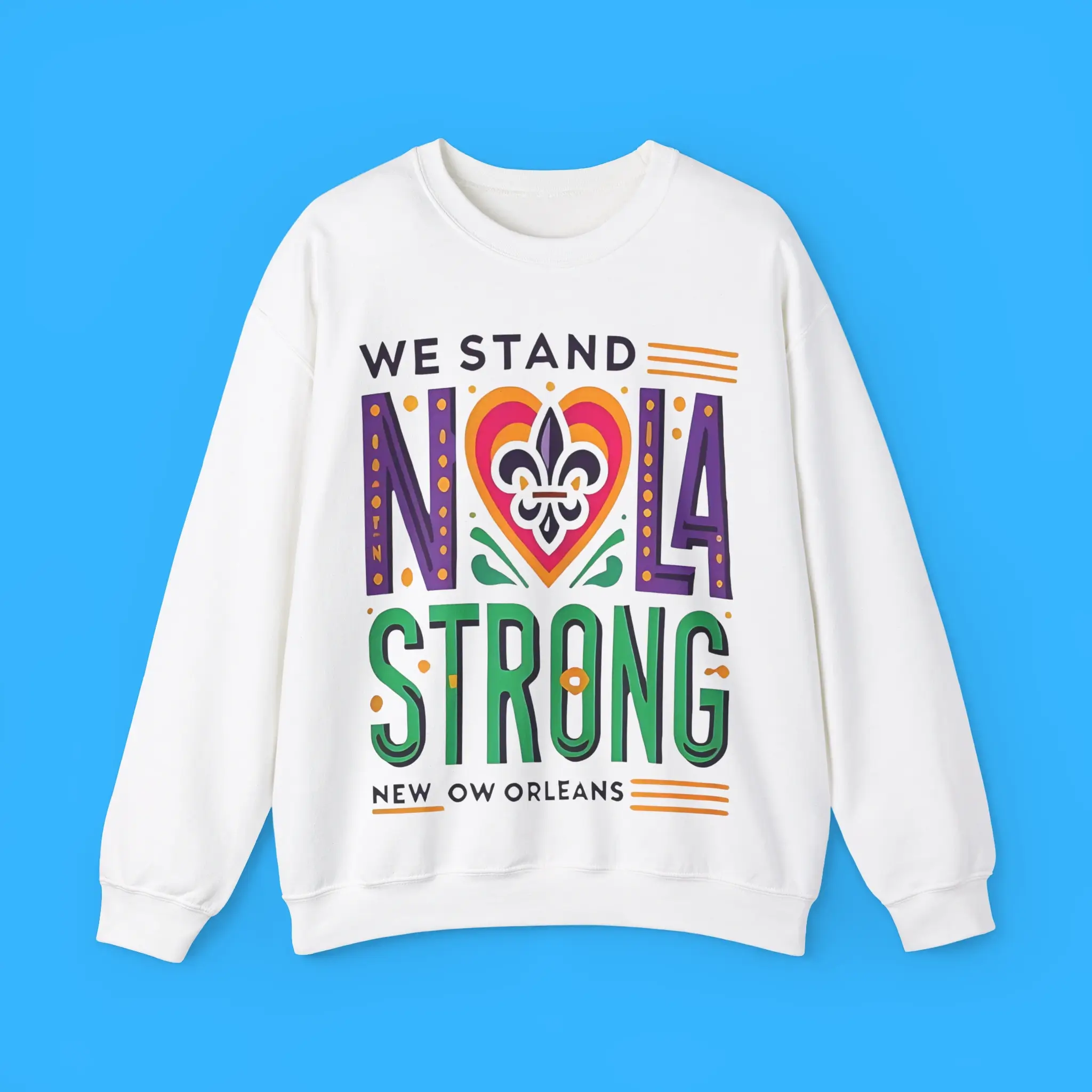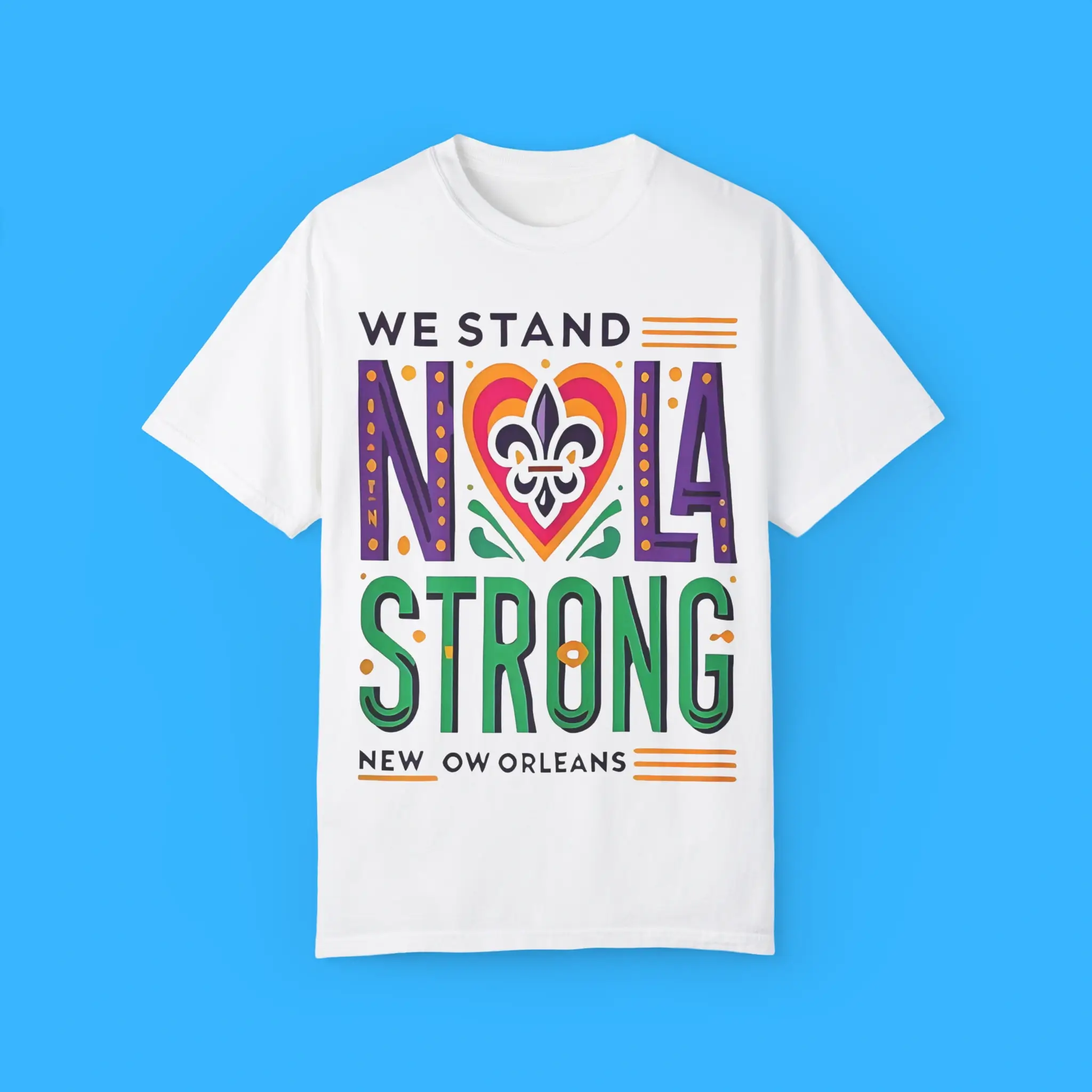 The bold “We Stand NOLA Strong” text is complemented by a fleur-de-lis, a symbol of New Orleans’ enduring soul. The design reflects the community’s strength, especially following Hurricane Katrina, while celebrating the city’s festive energy.