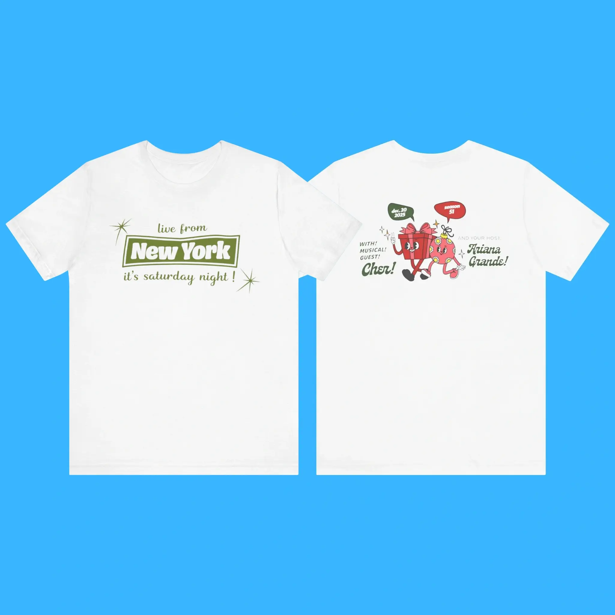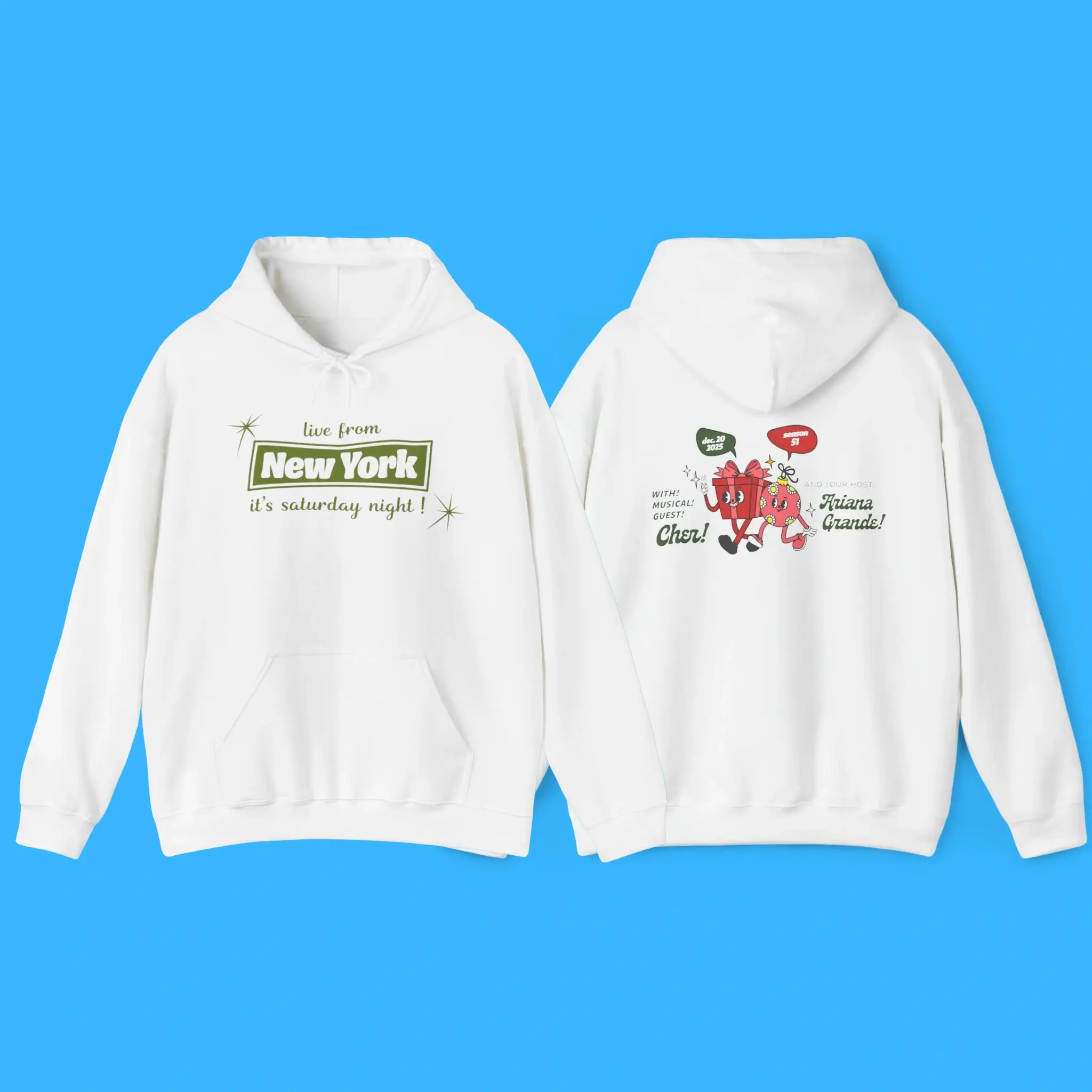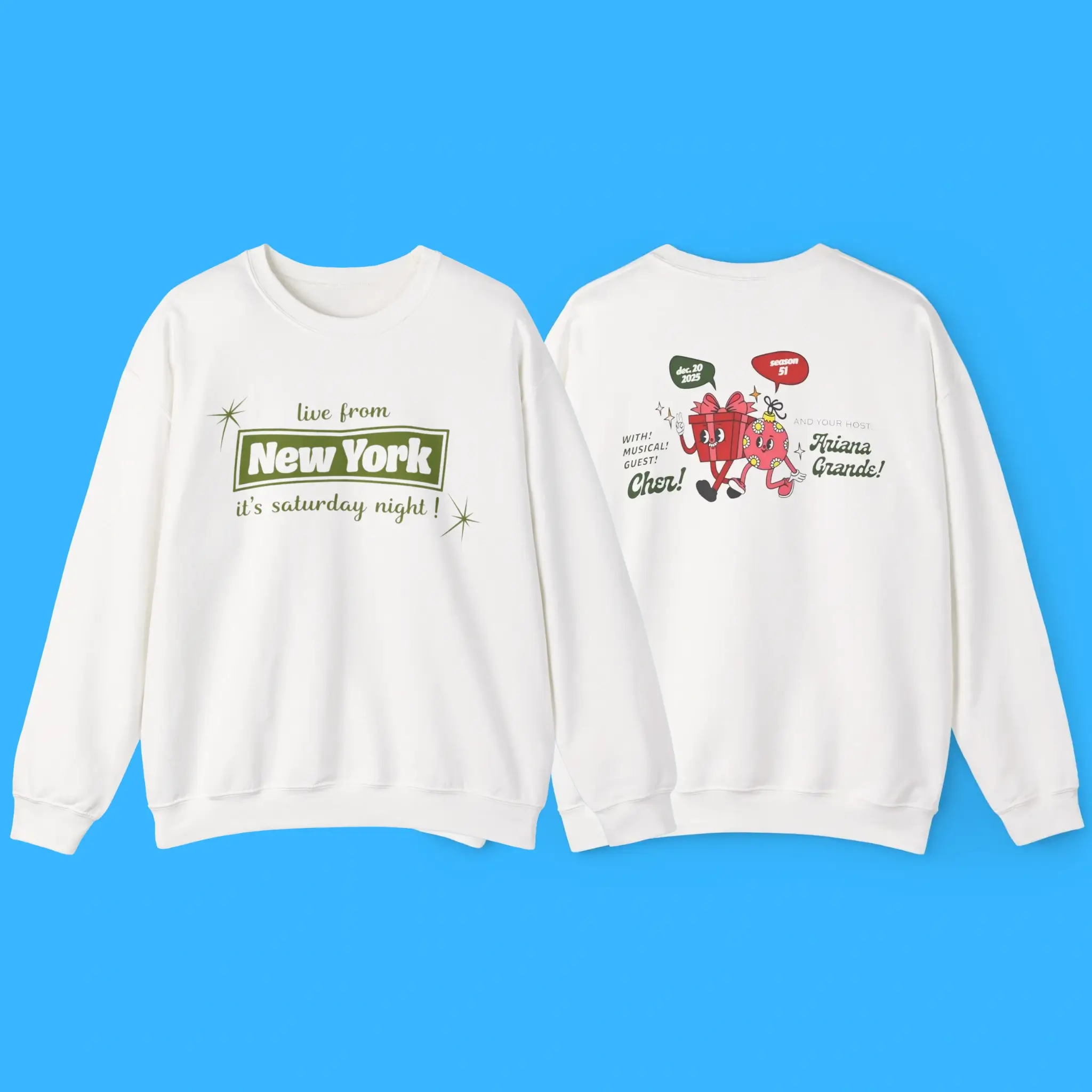 The front of this sweatshirt features the classic phrase “Live from New York, it’s Saturday Night!”. This instantly recognizable line captures the heart of SNL’s legacy. Meanwhile, the back reads “With Musical Guest Cher And Your Host Ariana Grande”, honoring two global pop icons in one historic moment.